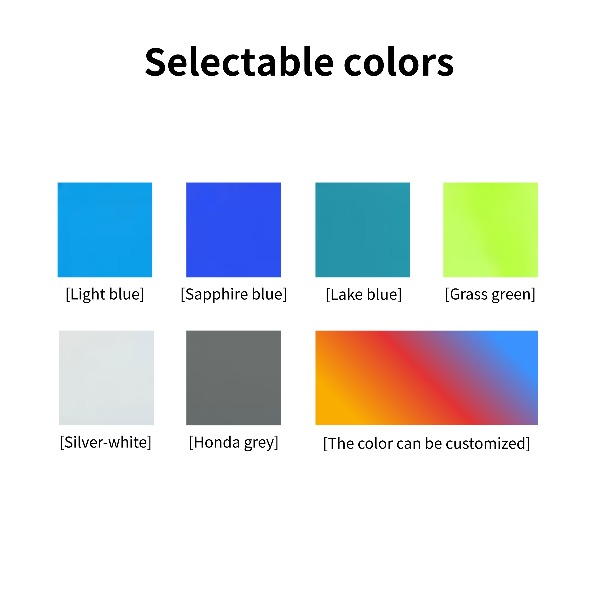 Optional colors Light blue, Royal blue, Lake blue, Silver white, Honda gray, Grass green, Custom colors (Customizable from 10 units or more)